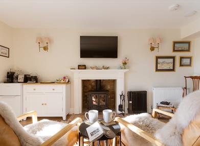 In the morning, guests are treated to a delicious in-room continental-style breakfast and a full English is available on request, all featuring locally sourced ingredients, prepared in the farmhouse Aga and served in a cozy dining area in the privacy of the suites. The B&B also offers various amenities such as a private fridge, kettle, toaster, Nespresso coffee machine, complimentary Wi-Fi, free access to Netflix, private parking, and access to a delightful south facing private garden exclusive to B&B guests.