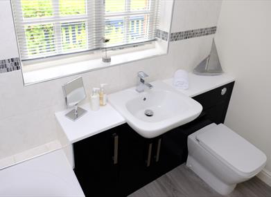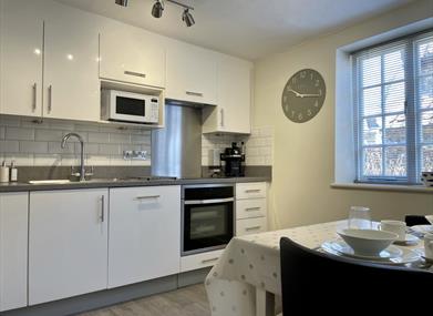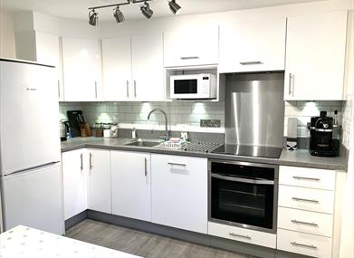 Kitchen is contemporary with electric oven and hob, dishwasher, microwave, Nespresso coffee machine and fridge freezer. Well stocked with kitchen equipment. DAB radio with Bluetooth.