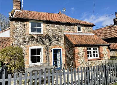 A charming detached period cottage with a wonderful feeling of tranquillity, tucked away just off the High Street in the picturesque village of Blakeney. This spacious flint cottage is located a short stroll up the hill from the quayside, delightful restaurants, pubs, cafes, gift shops and art galleries. Mays Cottage is a wonderful cosy retreat in the winter, where you can snuggle up in front of the wood burner with a good book at the end of the day; and in the warmer weather this hideaway has a large communal grass area, just the other side of the sunny courtyard garden, so you can fire up the BBQ, kick off your shoes and enjoy a glass of wine while the children play. Mays cottage has bike storage for the more energetic, so bring your bike and explore this part of the beautiful North Norfolk coast, an area of outstanding natural beauty. A wonderful holiday cottage at any time of year, for both couples and families alike. Shop/Pub: within walking distance.