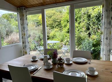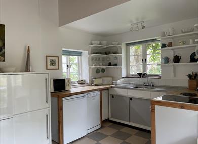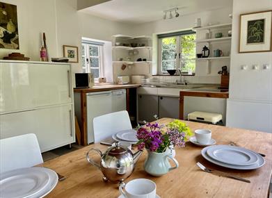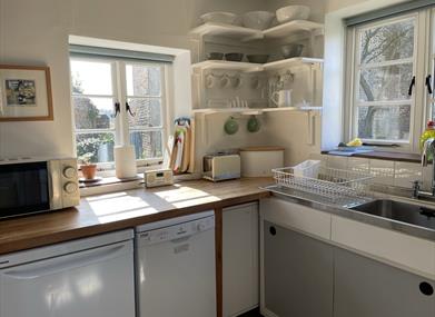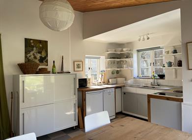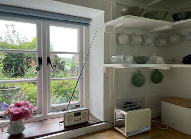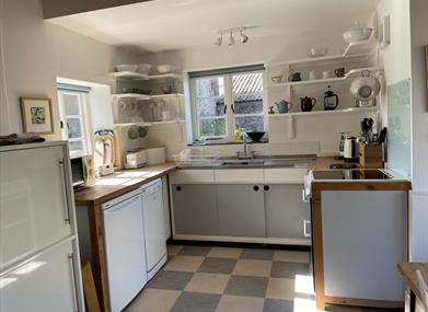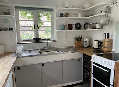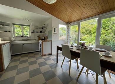 Kitchen/Breakfast Room 50’s style kitchen with original shelving and stainless-steel sink unit. Electric cooker, fridge, dishwasher, microwave, Nespresso coffee machine. Dining area with large patio doors leading to the garden.