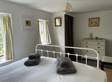 Bedroom 1 with King-sized cast-iron bed, cottage cupboard for hanging and storage, chest of drawers.