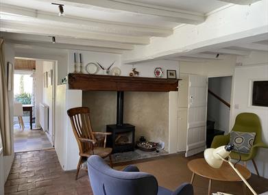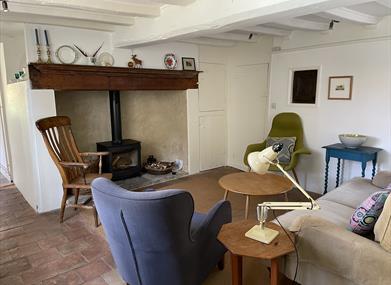 Sitting Room with beamed ceiling, inglenook fireplace with wood burning stove. Flat screen TV with built in DVD, stereo system. Free Wi-Fi. Door leading to ‘winder staircase’ to first floor and pantry for food storage.
